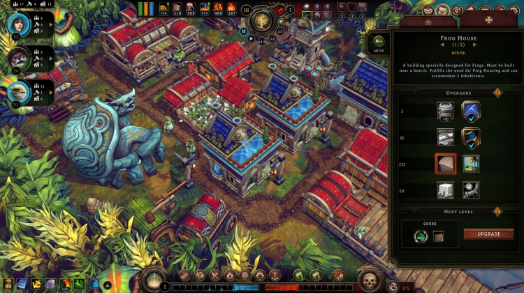 Housing holds a special place among their desires – in their pride the new Frogs refuse to live in ordinary shelters, demanding instead highly upgradeable Frog Houses be constructed especially for them. Each of the four upgrade levels introduces significant changes to the functionality of the housing, making for a crucial pursuit in dire circumstances.
