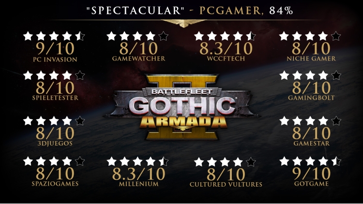 Battlefleet Gothic: Armada 2. Copyright © Games Workshop Limited 2018. Battlefleet Gothic: Armada, the Battlefleet Gothic: Armada logo, Battlefleet Gothic, the Battlefleet Gothic logo, GW, Games Workshop, Space Marine, 40K, Warhammer, Warhammer 40,000, 40,000, the ‘Aquila’ Double-headed Eagle logo, and all associated logos, illustrations, images, names, creatures, races, vehicles, locations, weapons, characters, and the distinctive likeness thereof, are either ® or TM, and/or © Games Workshop Limited, variably registered around the world, and used under licence. Battlefleet Gothic: Armada 2, developed by Tindalos Interactive, published by Focus Home Interactive. All rights reserved to their respective owners.