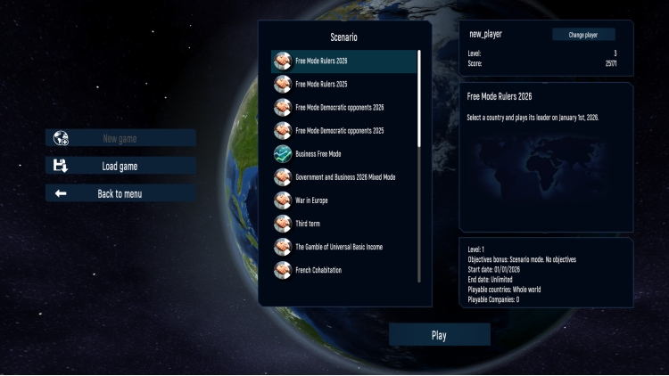 The game offers the possibility to start the campaign at the beginning of 2026 or at the beginning of 2025, as either a leader or an opponent.