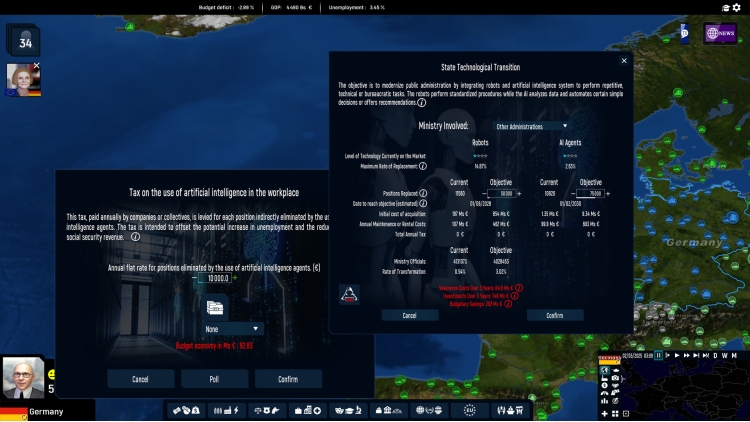 The game simulates the development of artificial intelligence and robotics and their impact on society, especially in terms of employment. The player can implement a technological transition in the State and in the public sector. They can also take advantage by taxing these technologies to compensate for the loss of jobs and redistribute the economic benefits more equitably.