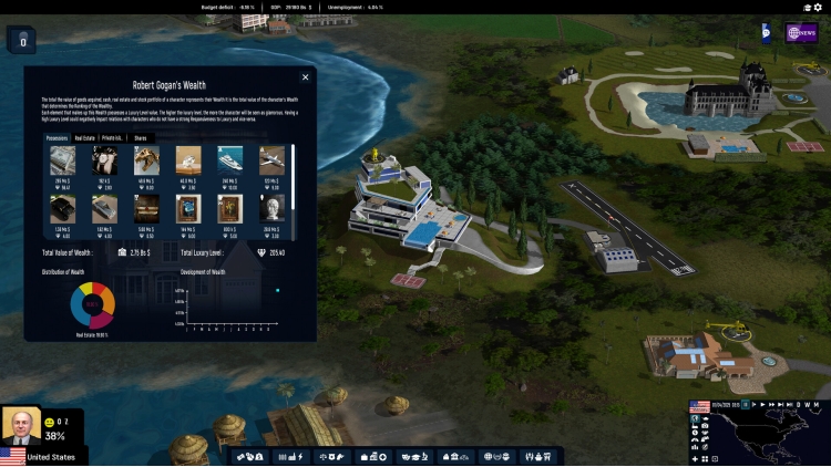 As a politician or businessman, players can grow their fortune. Various options are available: increase wealth, buy and sell valuable items (cars, private jets, paintings, yachts, diamonds...), build luxurious properties, stock market speculation… Wealth is one means to influence power either individually or in public opinion by creating, for example, foundations dedicated to certain causes, or by financing an association, a religion, or a political party.