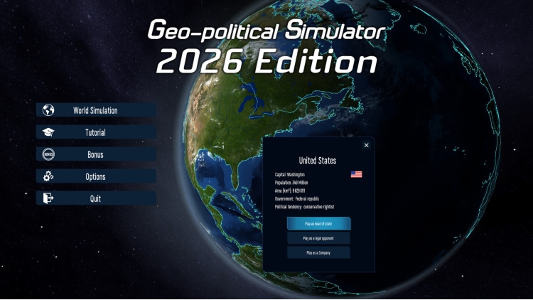 Geopolitical Simulator 2026 Edition is a simulation of our current world, recreating its features in-depth and across a number of domains: economic, political, military, social, financial, environmental, energetic, transportation…