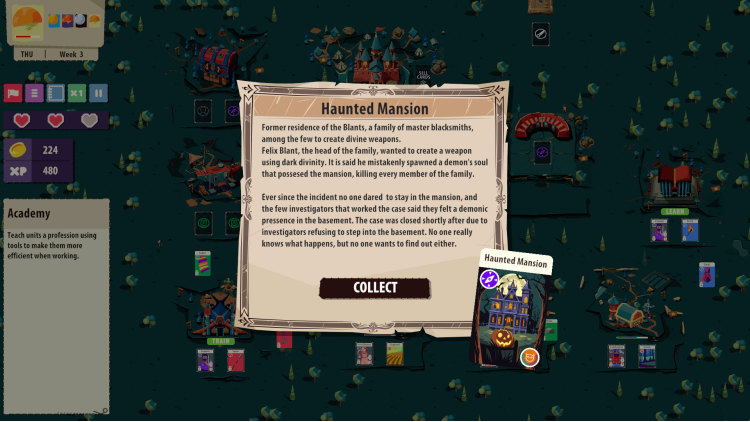 Academy - Teach peasants a profession using tools. Give a peasant an axe and you’ll get a lumberjack that can extract better resources from the forest.
