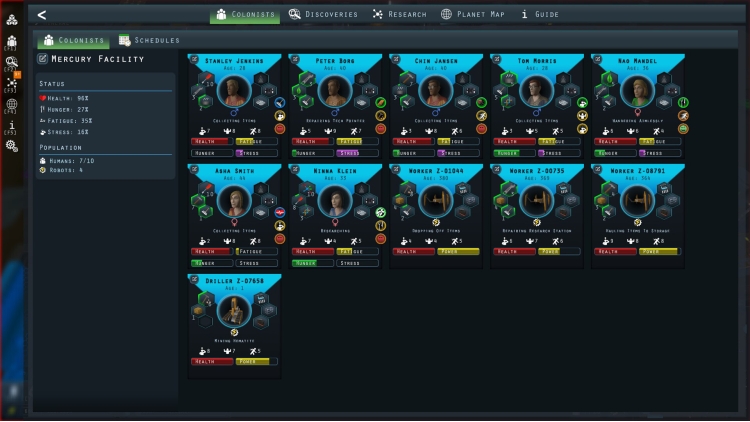 Uncover additional colonists, robots, and discoveries hidden in collapsed sections of the Mercury Facility.