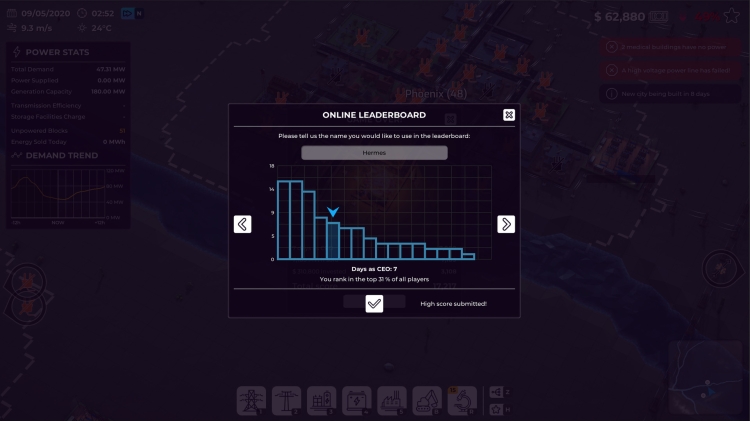 Each day, you’ll see new challenges thrown your way - be ready for anything! Sometimes, Mother Nature will surprise you with lightning bolts, solar flares, and falling trees which can put both your power lines and power plants at risk. In other cases, cities might experience increased power usage due to events like football games, the arrival of influencers, or the hosting of an extremely popular TV show. Make sure you provide a smooth experience for everyone involved and keep the people happy!
