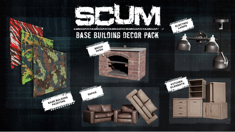 Introducing the SCUM Base Building Decor Pack! In this cosmetic DLC, freshen up your base interior with deluxe versions of furniture available in the game, give it a brand-new look with painting patterns, and show everyone passing by who the man is!